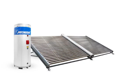 Máy nước nóng năng lượng mặt trời tập trung dạng ống chân không MEGASUN có cấu tạo ống hấp thu năng lượng mặt trời nằm riêng rẽ và đầu ống không gắn trực tiếp vào bình bảo ôn.