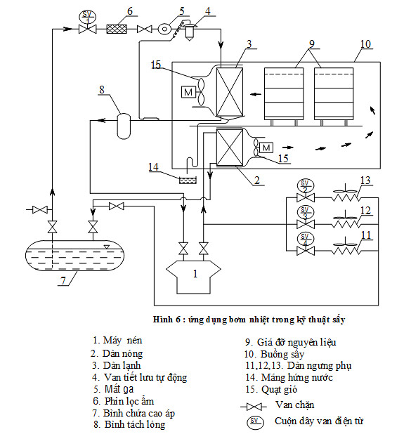 Trong điều kiện ở Việt Nam hệ số này thường vào khoảng như vậy khi sử dụng bơm nhiệt (heat pump) thì năng lượng tiêu tốn cho máy nén với công suất N (kw), ta thu được từ 4 đến 5N (kw) lượng nhiệt thải ra ở thiết bị ngưng tụ và lượng nhiệt này sẽ phục vụ cho các công nghệ CBTP, nên khả năng tiết kiệm năng lượng khi dùng bơm nhiệt là rất lớn.
